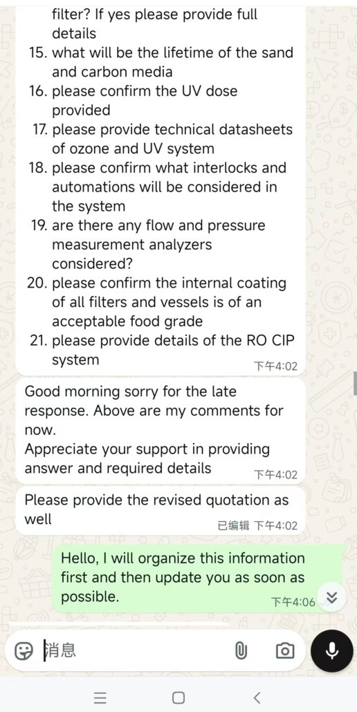 We responded honestly: “Our expertise is water treatment equipment; filling machines are not our strength,” while adding: “We can recommend long-term partner filling machine suppliers”—avoiding overpromising while demonstrating ongoing service support.