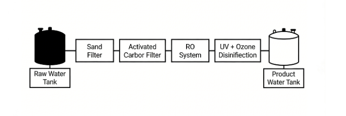 The quotation clearly covered the full process: Raw Water Tank → Sand Filter → Activated Carbon Filter → RO System → UV + Ozone Disinfection → Product Water Tank, with a note: “Not a standalone RO device, but a complete RO Water Treatment System”—immediately resolving his worry about “system completeness.”