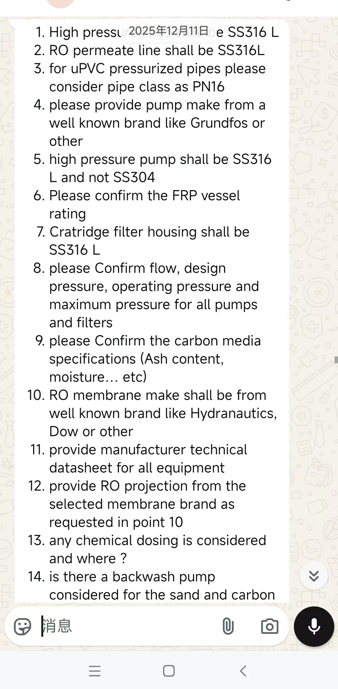 (The remaining 11 questions: technical manuals, RO membrane projection data, chemical dosing, backwash pumps, media lifespan, UV dosage, ozone specifications, interlock automation, flow/pressure analyzers, food-grade coatings, CIP systems…)