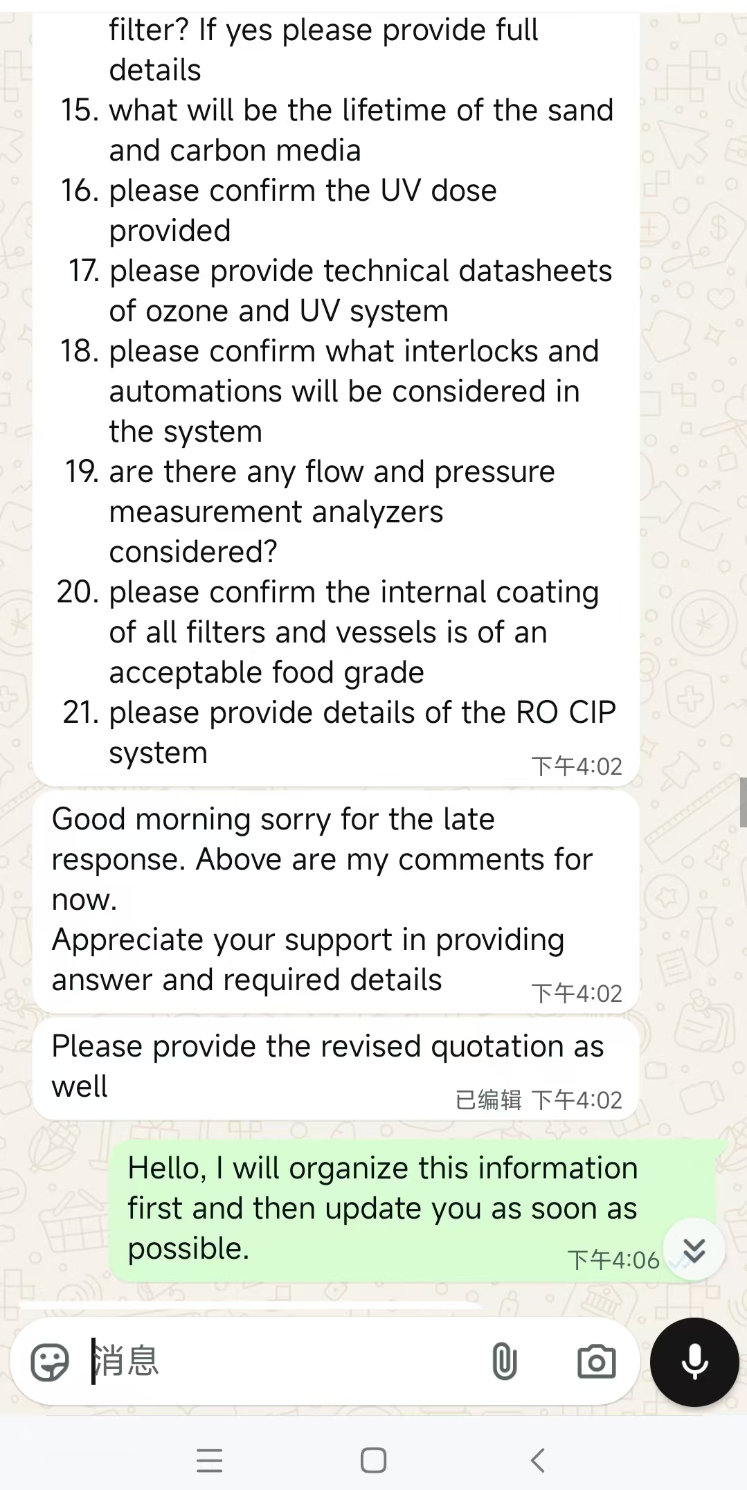 After sending the revised quotation, Ahmed’s response was simple: “Well noted. I will check everything and come back to you”—no exaggerated praise, but this calm reply was recognition that all 21 questions had been addressed item by item.